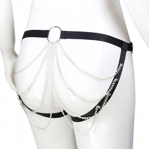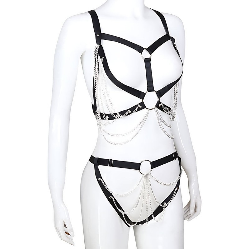 Este arnés corporal BDSM de SENS es un conjunto de dos piezas diseñado para combinar líneas firmes con el brillo inquietante de las cadenas. La parte superior traza el pecho con correas abiertas que convergen en anillas centrales, dejando que las cadenas caigan y se deslicen con cada movimiento, aportando dinamismo y presencia. El arnés inferior rodea las caderas y enfatiza la silueta con un juego visual que se completa desde atrás, donde las cadenas toman protagonismo. Pensado para juegos en pareja, su ajuste regulable permite llevarlo con seguridad y comodidad, transformándolo en un accesorio que no acompaña la escena, la protagoniza.