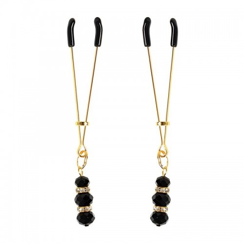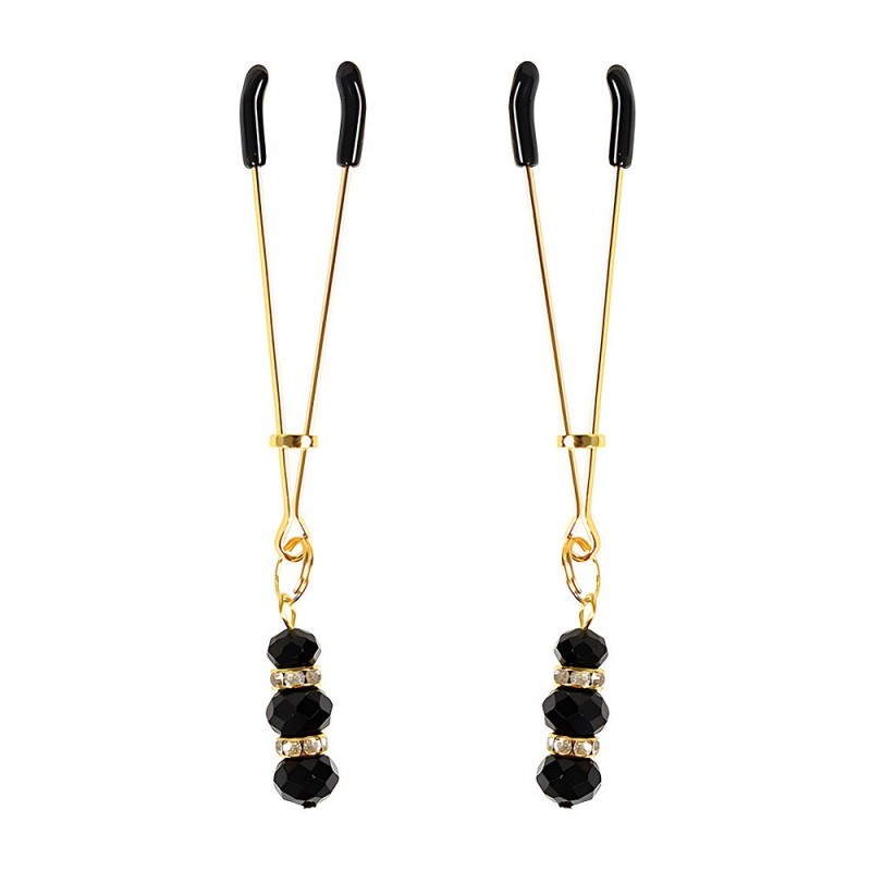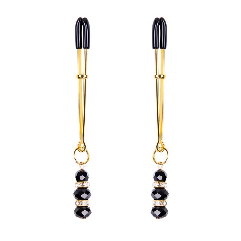 Estas pinzas para pezones de SENS con piedras de Onyx (fantasía) destacan por su silueta alargada y una estética elegante y sofisticada. El cuerpo metálico en tono dorado sostiene con delicadeza tres cuentas negras facetadas, acompañadas por circones que aportan brillo y generan un juego visual de peso y movimiento. Las pinzas, recubiertas con silicona y complementadas por un anillo regulador de intensidad, transforman la estimulación en una experiencia tan visualmente impactante como sensorial