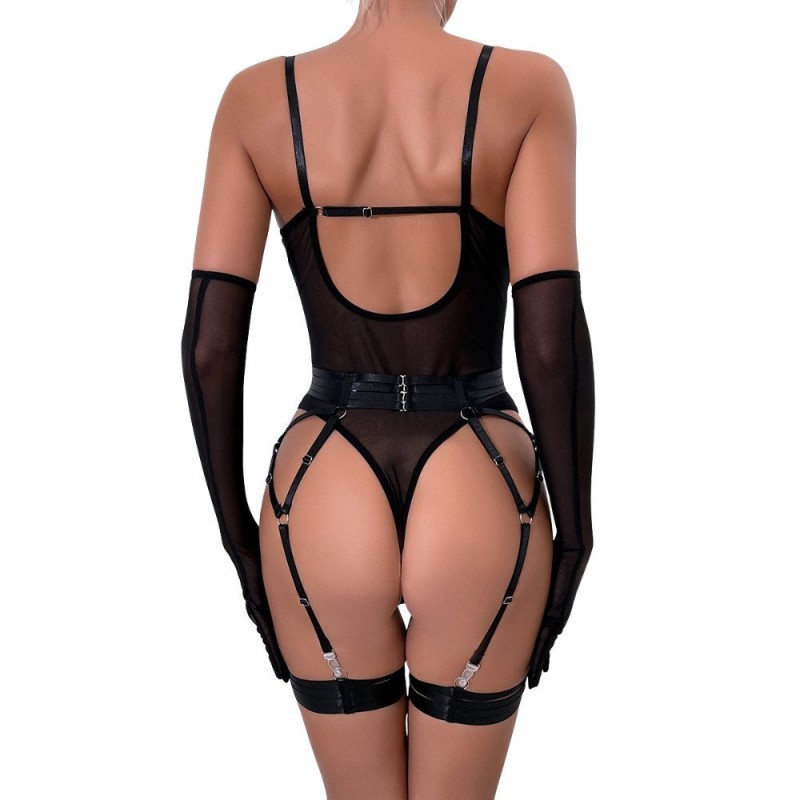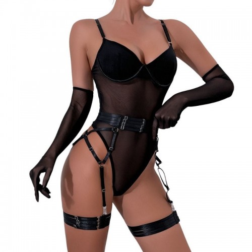 Este body se adapta al cuerpo como una segunda piel, revelando con sutileza y elegancia. Las copas estructuradas realzan el busto y crean un escote definido, mientras las tiras finas y el cinturón enmarcan la cintura con un aire dominante. El portaligas incorporado con ligas regulables y guantes a juego completan un conjunto seductor, sofisticado y lleno de carácter.