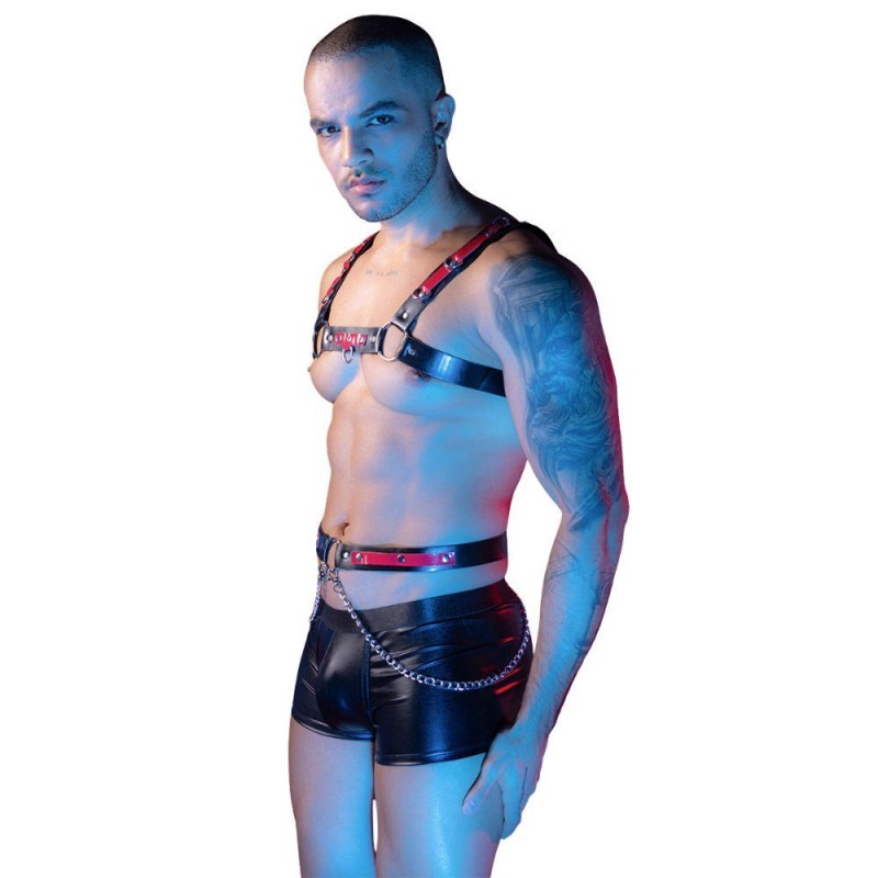 Este conjunto de lencería masculina en negro de acabado brillante tipo látex combina sensualidad y actitud dominante. El arnés enmarca el torso con líneas firmes que resaltan el pecho, mientras los detalles en rojo aportan un contraste audaz y seductor. El cinturón con anillos y cadenas metálicas suma carácter y un guiño fetiche que eleva el look. El bóxer de calce ceñido estiliza la figura y completa una propuesta pensada para destacar con seguridad.