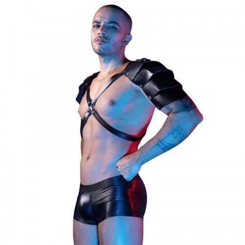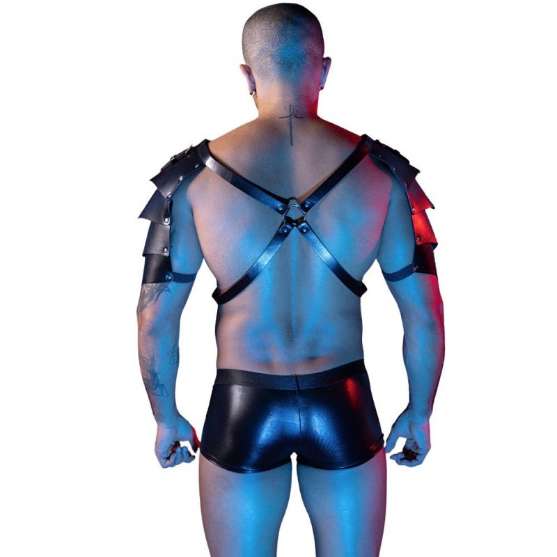 Este conjunto de lencería masculina en negro de acabado brillante tipo látex combina estética fetiche y sensualidad. El arnés de diseño cruzado enmarca el torso y resalta la figura con líneas firmes y definidas. Las hombreras estructuradas aportan carácter y un aire imponente, creando una silueta poderosa y atractiva. El brief de calce ceñido completa el look con comodidad y estilo. Una propuesta pensada para destacar, provocar miradas y proyectar seguridad.