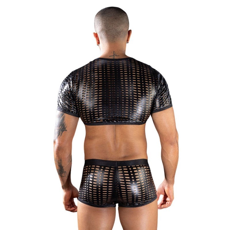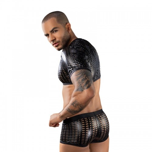 Este conjunto de lencería masculina en color negro con acabado brillante tipo látex, combina audacia y sensualidad. El top de manga corta presenta un patrón geométrico calado que deja entrever la piel, creando un juego visual provocador que realza el torso y los hombros. El bóxer a juego incorpora el mismo diseño calado en los laterales y parte posterior, mientras el panel frontal liso aporta contraste, soporte y un calce cómodo. Un conjunto pensado para destacar el cuerpo con seguridad, ideal para quienes disfrutan de una estética atrevida y sofisticada.