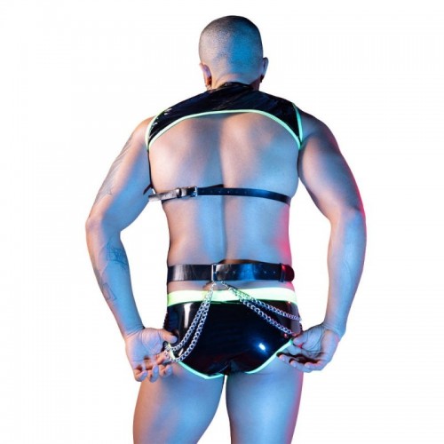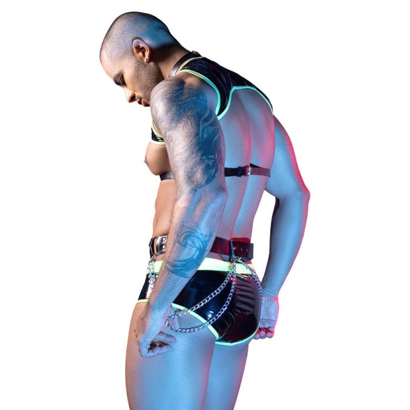 Este conjunto de lencería masculina en negro de acabado brillante tipo látex combina provocación y estilo en cada detalle. El top de corte abierto enmarca el pecho con un diseño audaz, mientras el arnés y cinturón con hebillas y cadenas metálicas aportan carácter y actitud dominante. El brief estiliza la silueta con un calce firme y cómodo. Sus bordes en tono neón con efecto reflectante iluminan el contorno del cuerpo y crean un contraste visual irresistible. Un conjunto pensado para destacar, seducir y dejar huella.