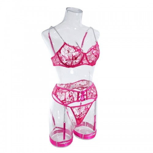 Este conjunto de encaje floral semitransparente revela y sugiere con sutileza. El sostén con copas estructuradas y tirantes de cadena realza el busto con toque moderno y juvenil, mientras el portaligas de cintura alta enmarca la figura con sensualidad. La tanga y las ligas con delicadas cadenas crean un juego visual femenino, atrevido y profundamente seductor.