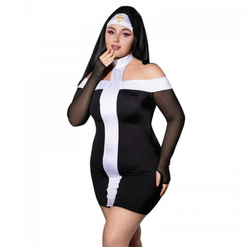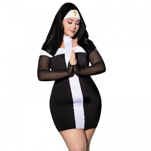 Este disfraz combina inocencia y picardía en una silueta que abraza las curvas con suavidad. El vestido negro de ajuste ceñido estiliza la figura, mientras el contraste en forma de cruz alarga visualmente el torso y se integra a un cuello alto estructurado que aporta carácter y realza el diseño. Las mangas de malla translúcida suman un toque delicado y sugerente, y el velo completa un look perfecto para juegos de rol llenos de complicidad y diversión.