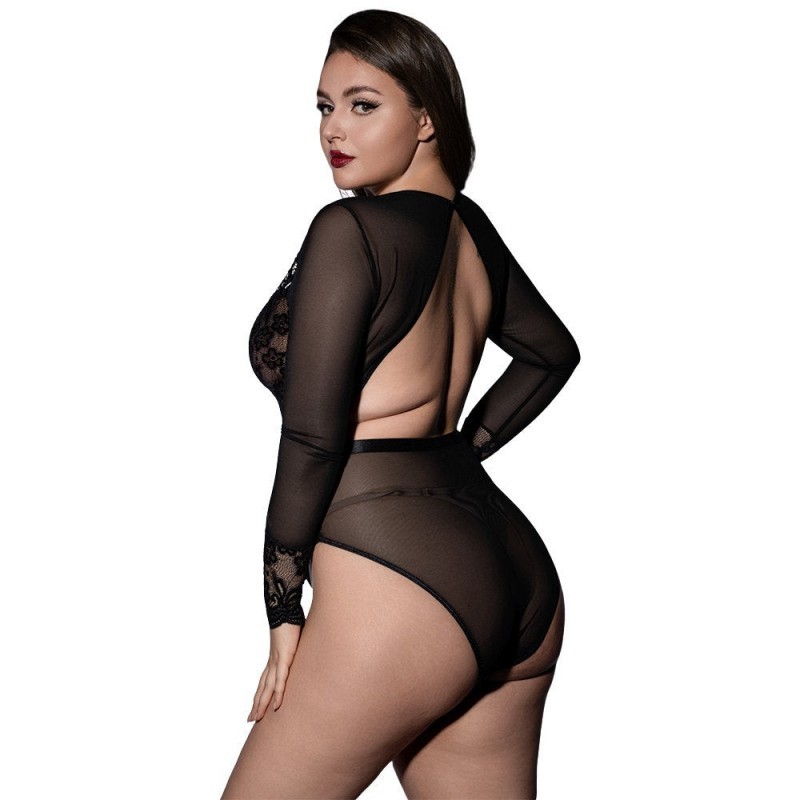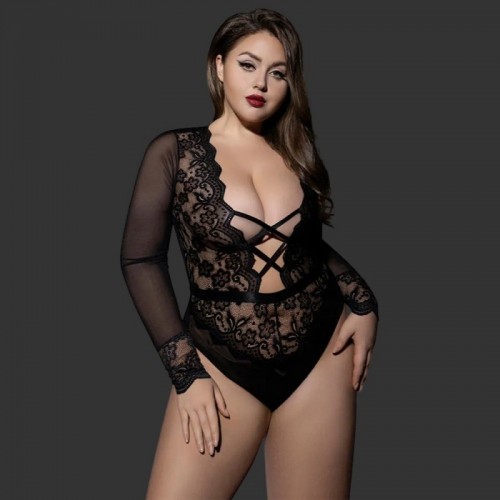 Este body negro combina elegancia y provocación en un diseño que realza cada curva con seguridad. El escote profundo enmarca el busto con delicado encaje floral, mientras las cintas entrecruzadas en el centro aportan un detalle atrevido que dirige la mirada. Las mangas largas de malla translúcida equilibran la propuesta con sofisticación, y la espalda abierta crea un contraste impactante que estiliza la silueta desde todos los ángulos.