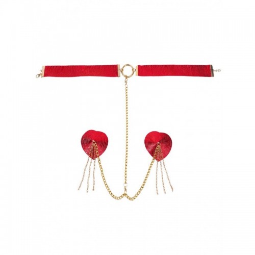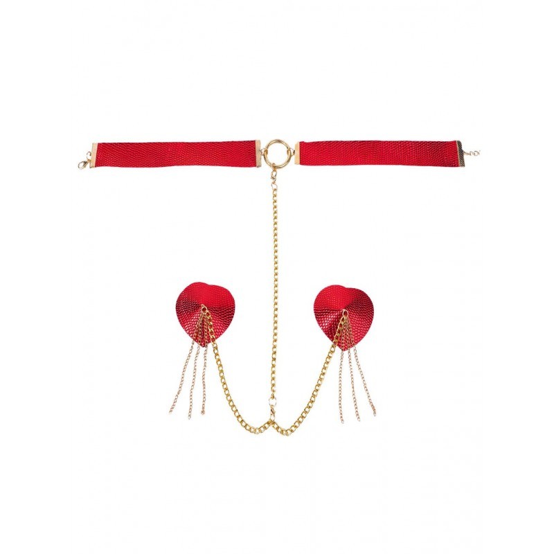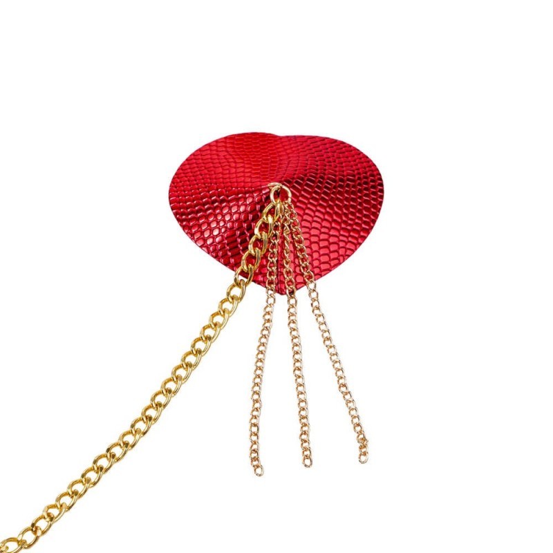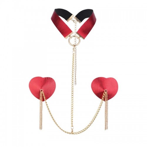 Un accesorio diseñado para convertir la piel en escenario. Las pezoneras texturizadas en forma de corazón, en rojo profundo y acabado brillante, se realzan con delicadas cadenas doradas que aportan movimiento y un brillo cautivador. El collar a juego enmarca el cuello con elegancia, dando vida a una pieza lúdica, sofisticada y perfecta para seducir mientras eleva cualquier look íntimo.