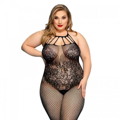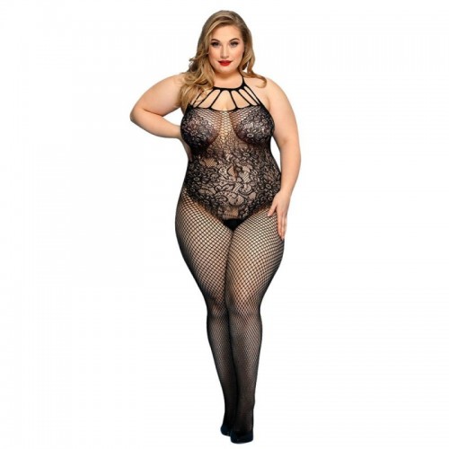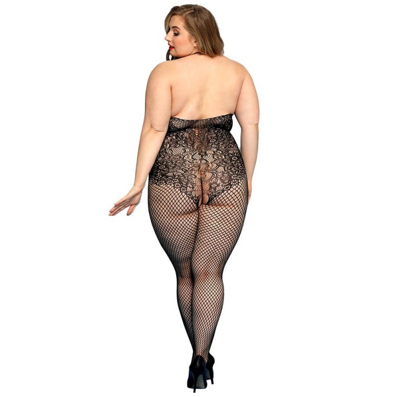 Este enterito de malla negro combina red fina y encaje floral en un diseño que envuelve el cuerpo con efecto visual irresistible. El escote con tiras decorativas dirige la mirada y realza el busto con sutileza. La mezcla de tramas estiliza la silueta y aporta contraste. Su tejido elasticado se adapta cómodamente resaltando cada curva.